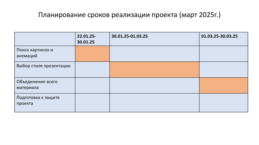 Планирование сроков реализации проекта (март 2025г.)22.01.2530.01.25