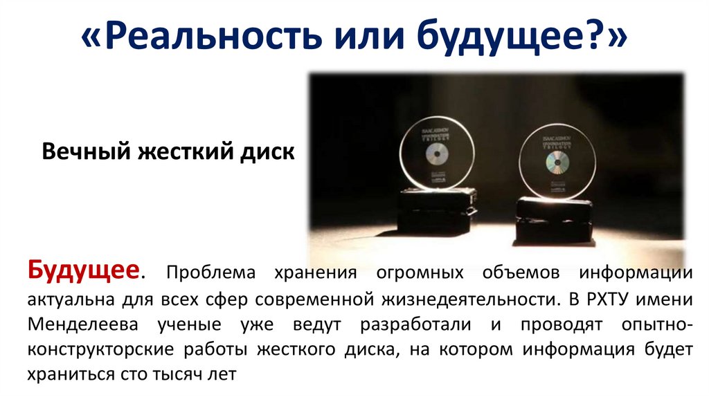 Менделеева ученые уже ведут разработали и проводят опытноконструкторские работы жесткого диска, на котором информация будет