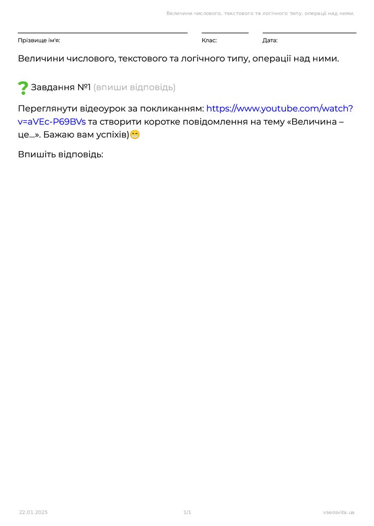 Величини числового, текстового та логічного типу, операції над ними.Прізвище ім'я: