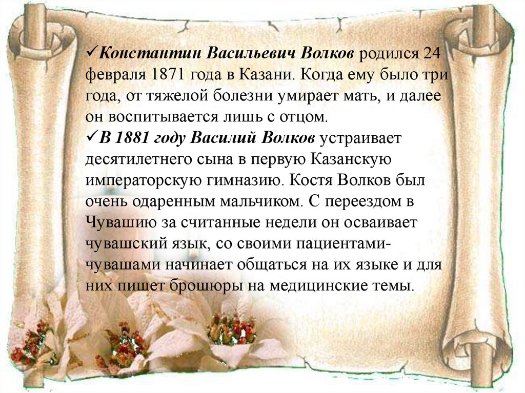 Константин Васильевич Волков родился 24февраля 1871 года в Казани. Когда ему было три