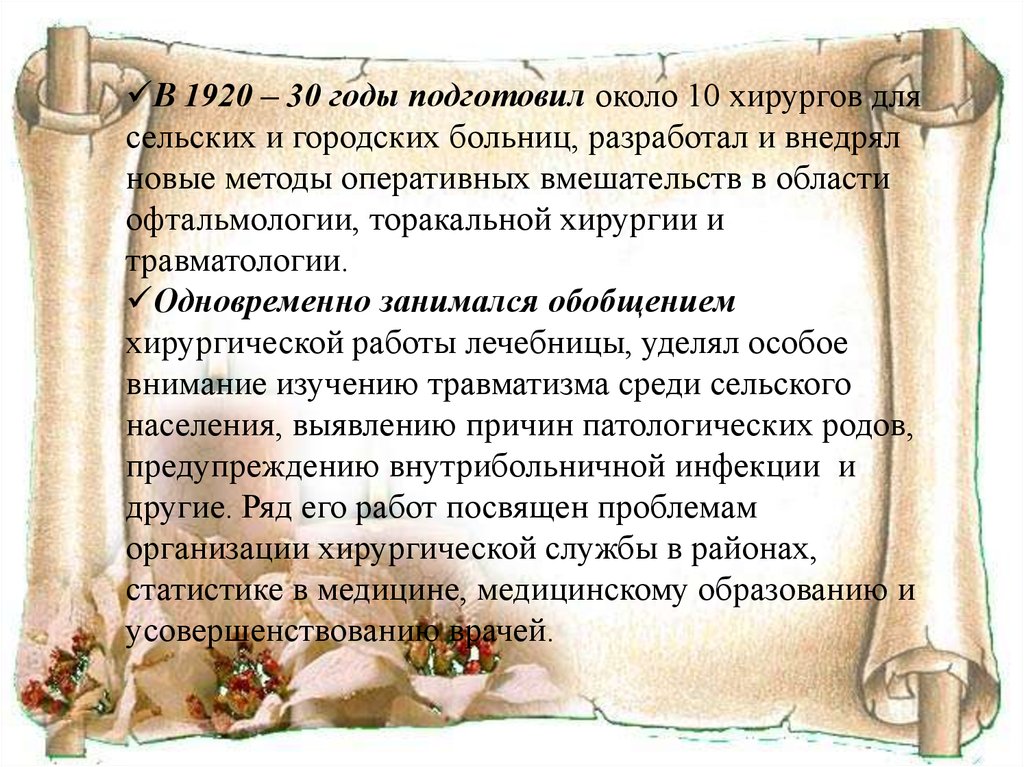 В 1920 – 30 годы подготовил около 10 хирургов длясельских и городских больниц, разработал и внедрял