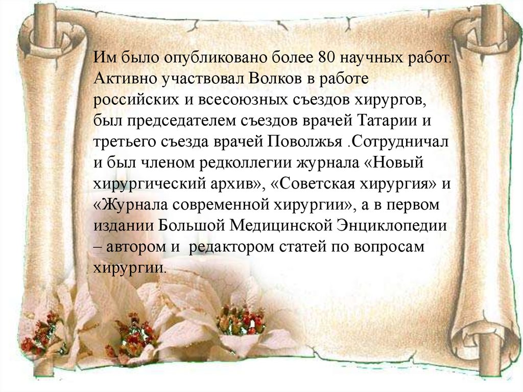Им было опубликовано более 80 научных работ.Активно участвовал Волков в работе