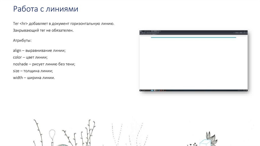 Работа с линиямиТег <hr> добавляет в документ горизонтальную линию.