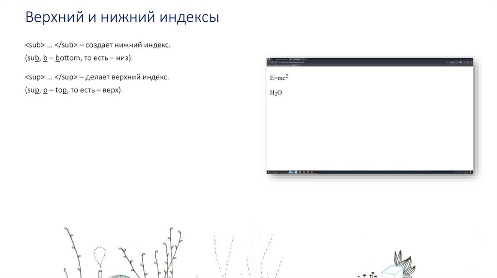 Верхний и нижний индексы<sub> … </sub> – создает нижний индекс.
