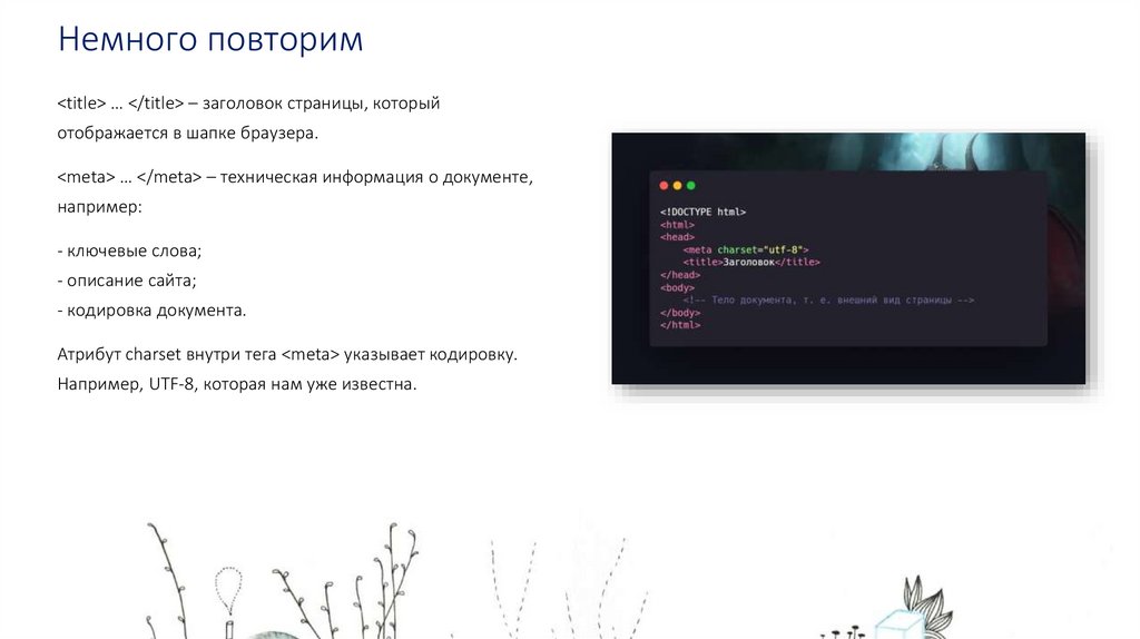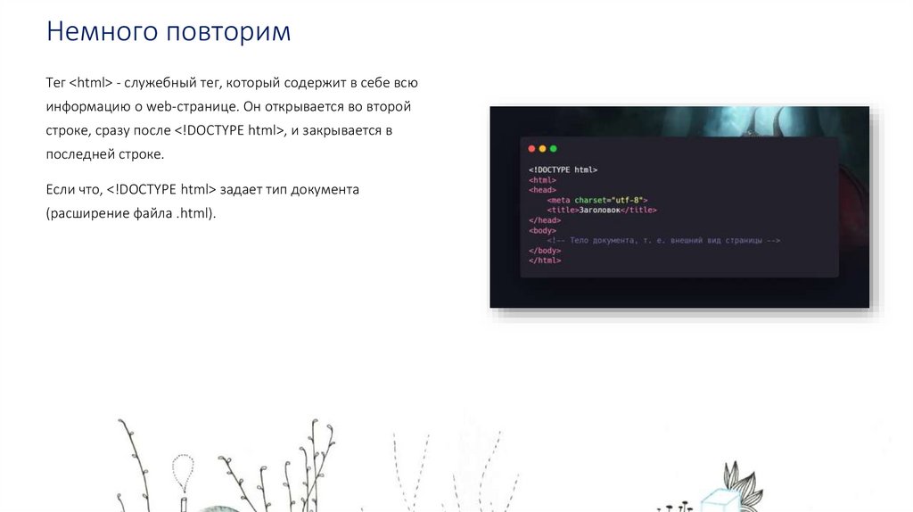 Немного повторимТег <html> - служебный тег, который содержит в себе всю