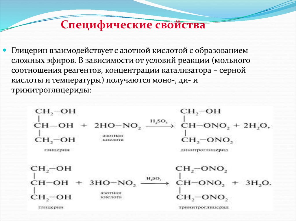 Специфические свойстваГлицерин взаимодействует с азотной кислотой с образованием