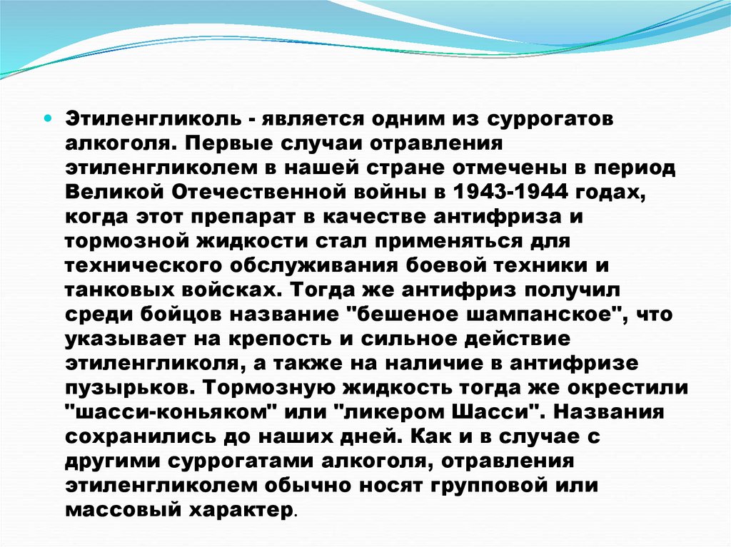 Этиленгликоль - является одним из суррогатовалкоголя. Первые случаи отравления
