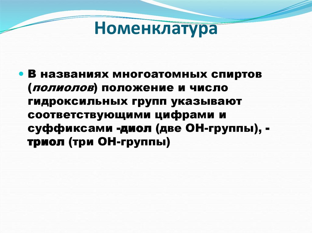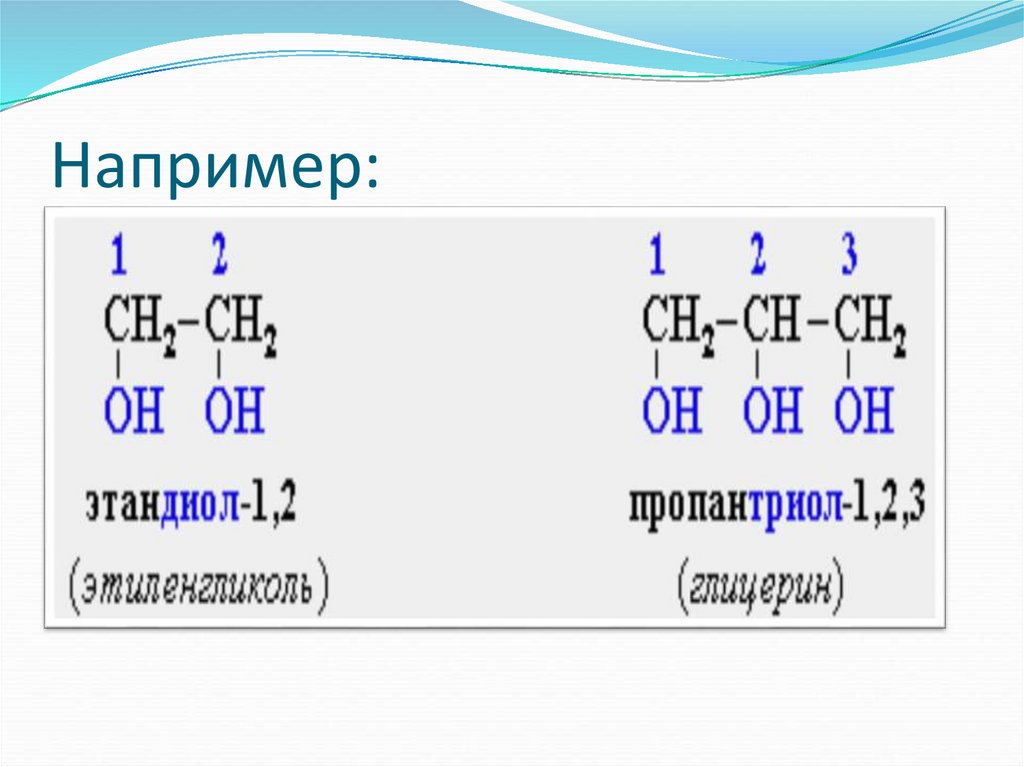 суффиксами -диол (две ОН-группы), триол (три ОН-группы)