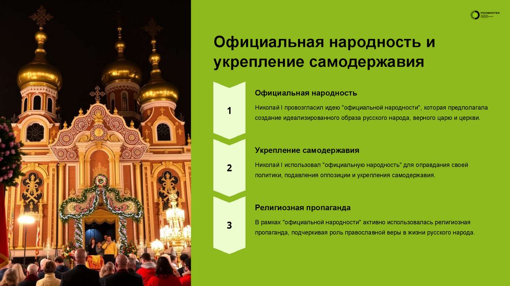 Николай I провозгласил идею "официальной народности", которая предполагала