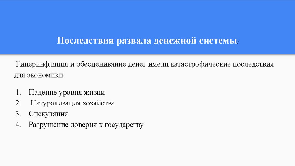 Последствия развала денежной системы:Гиперинфляция и обесценивание денег имели катастрофические последствия