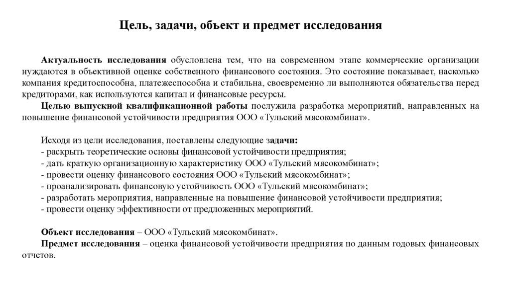 - проанализировать финансовую устойчивость ООО «Тульский мясокомбинат»;