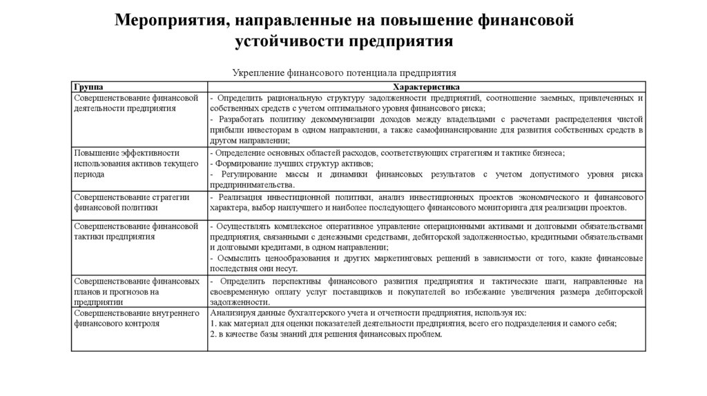 - разработать мероприятия, направленные на повышение финансовой устойчивости предприятия;