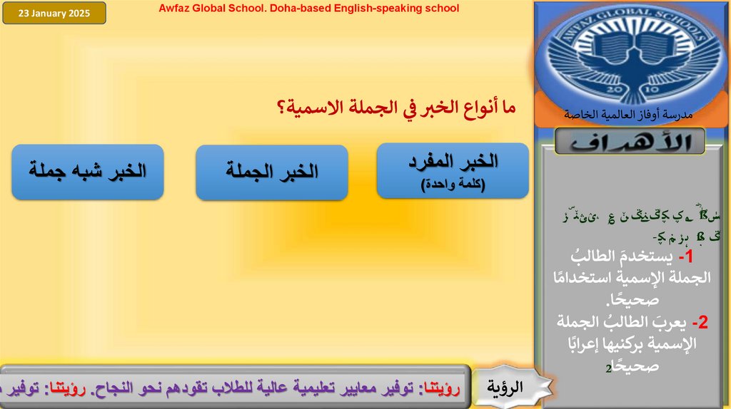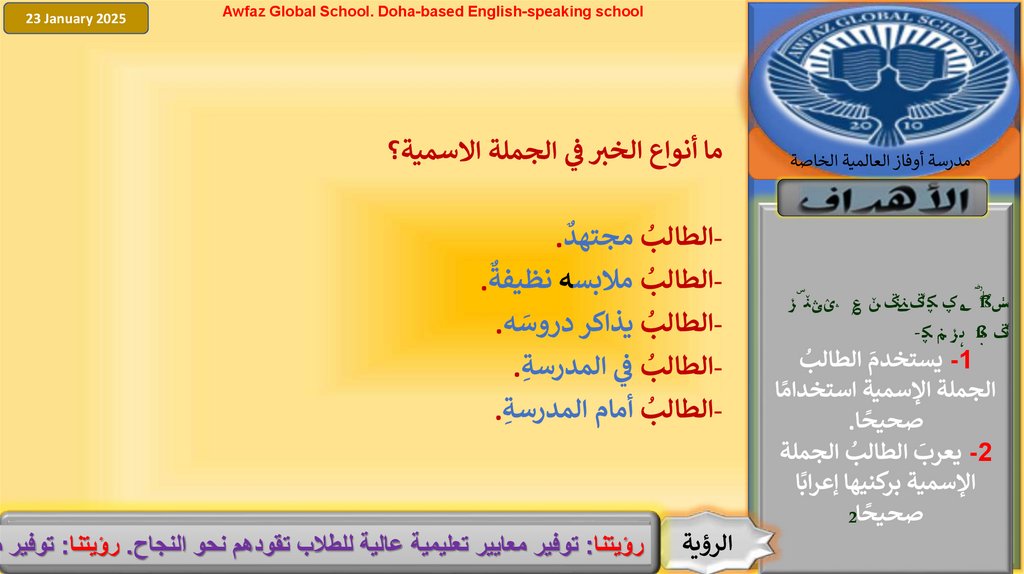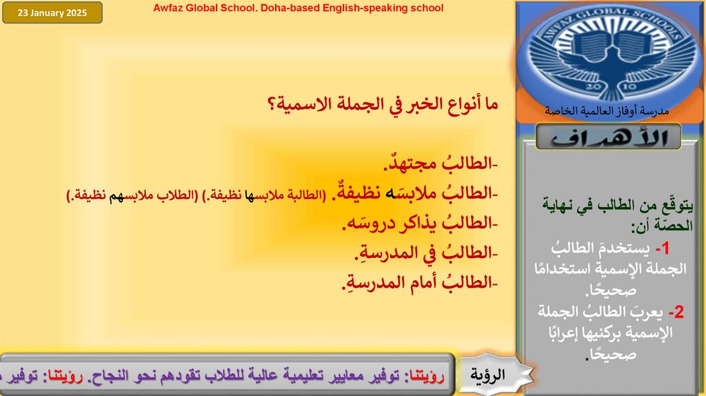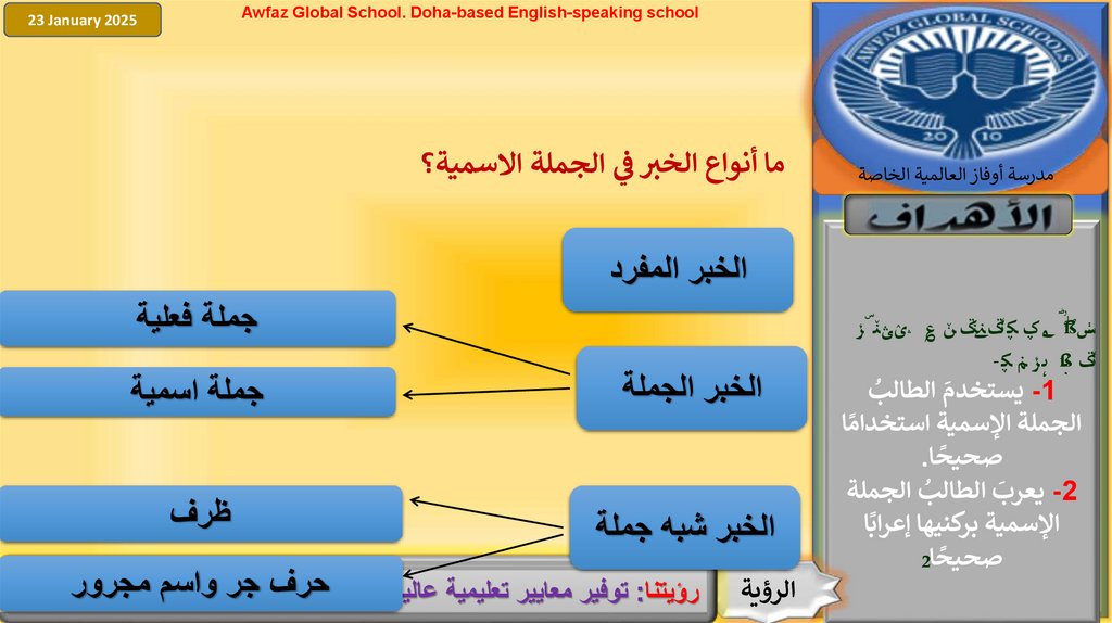 Awfaz Global School. Doha-based English-speaking schoolحدد المبتدأ والخبر في الجمل اآلتية ثم بين نوع الخبر