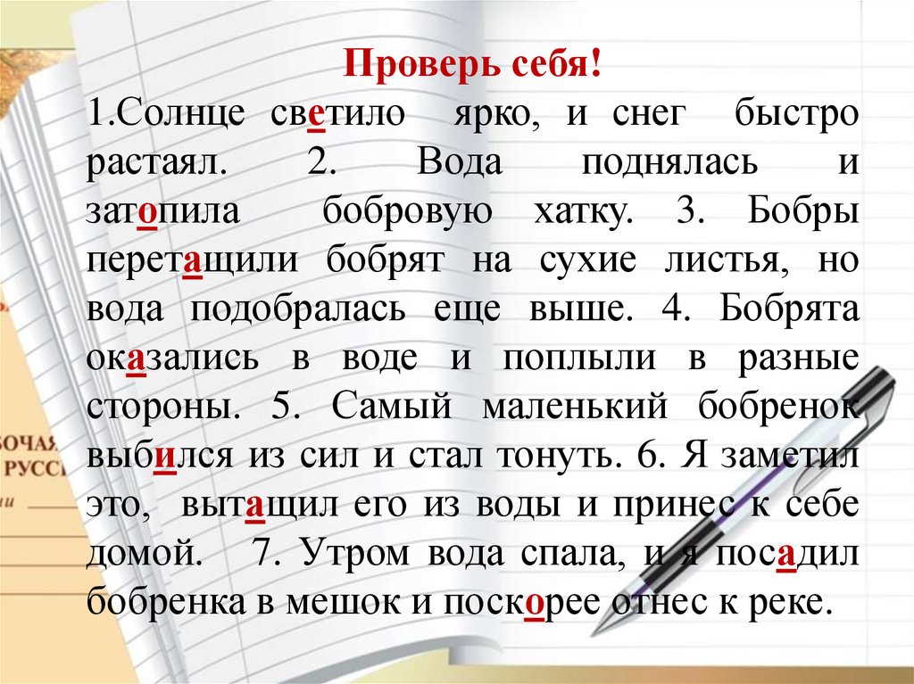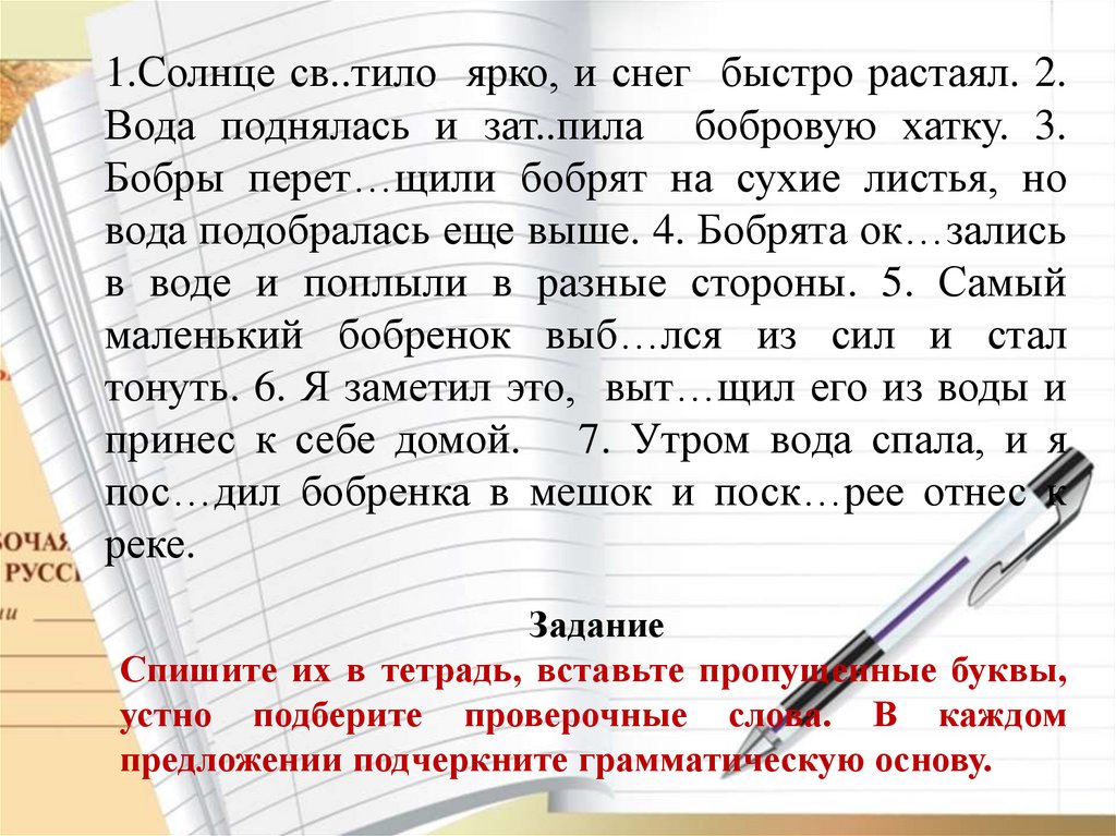 1.Солнце св..тило ярко, и снег быстро растаял. 2.Вода поднялась и зат..пила бобровую хатку. 3.