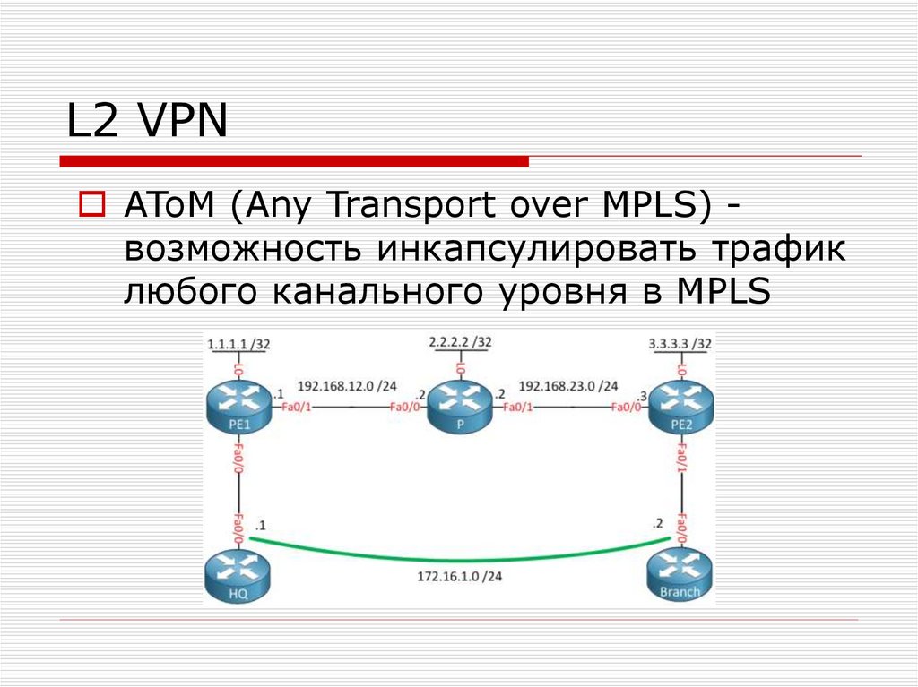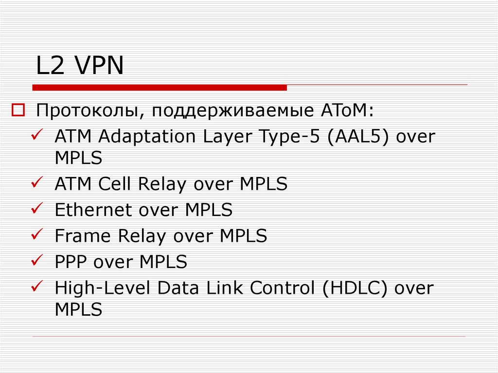 AToM (Any Transport over MPLS) возможность инкапсулировать трафиклюбого канального уровня в MPLS