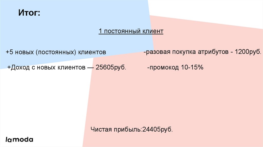 Прибыль:Средний чек на Lamoda в 2023 году составляет 5121 рубль