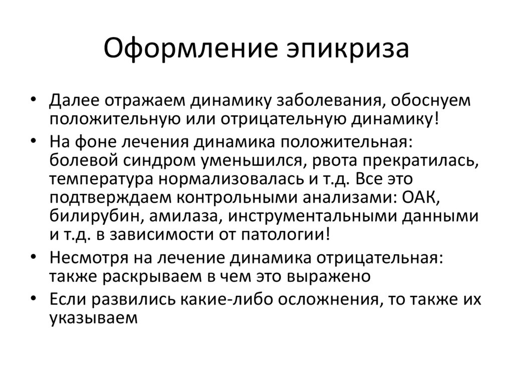 Оформление эпикриза• Далее отражаем динамику заболевания, обоснуем