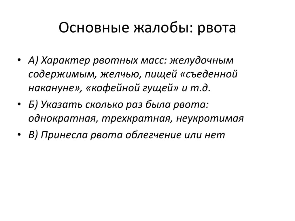 Основные жалобы: рвота• А) Характер рвотных масс: желудочным