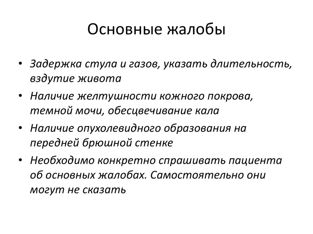 Основные жалобы• Задержка стула и газов, указать длительность,