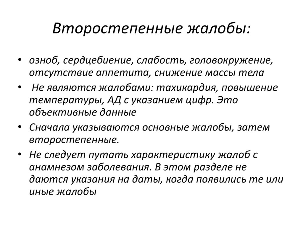 Второстепенные жалобы:• озноб, сердцебиение, слабость, головокружение,