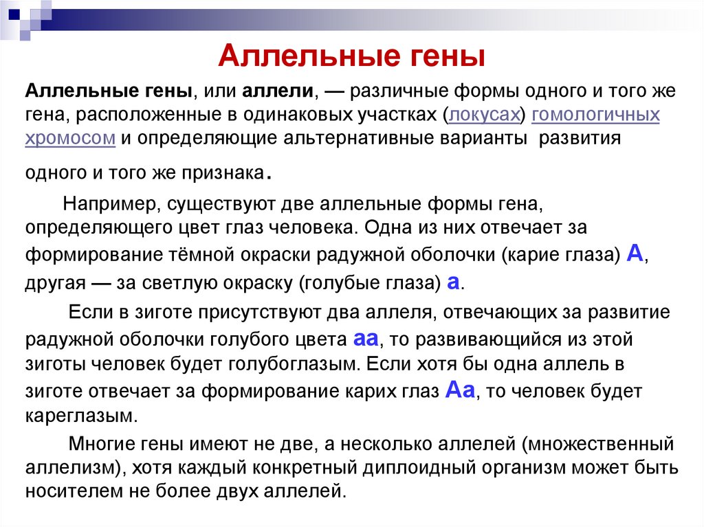 Аллельные гены, или аллели, — различные формы одного и того жегена, расположенные в одинаковых участках (локусах) гомологичных
