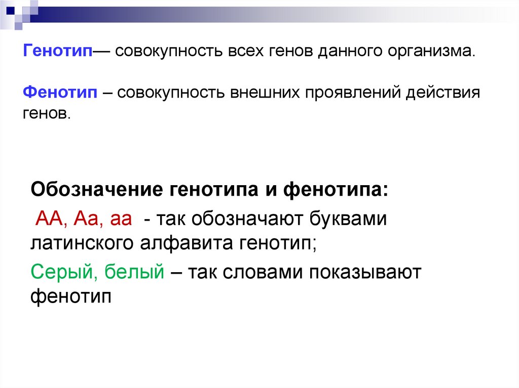 Обозначение генотипа и фенотипа:АА, Аа, аа - так обозначают буквами