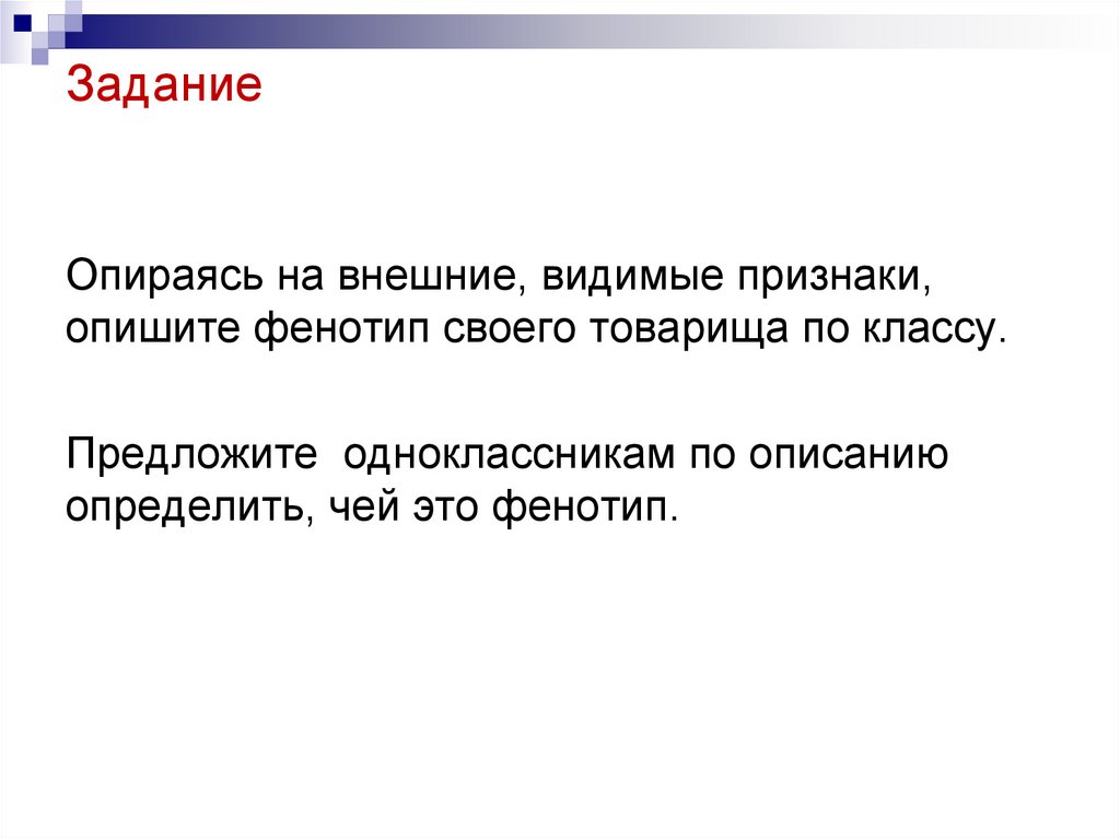 Опираясь на внешние, видимые признаки,опишите фенотип своего товарища по классу.