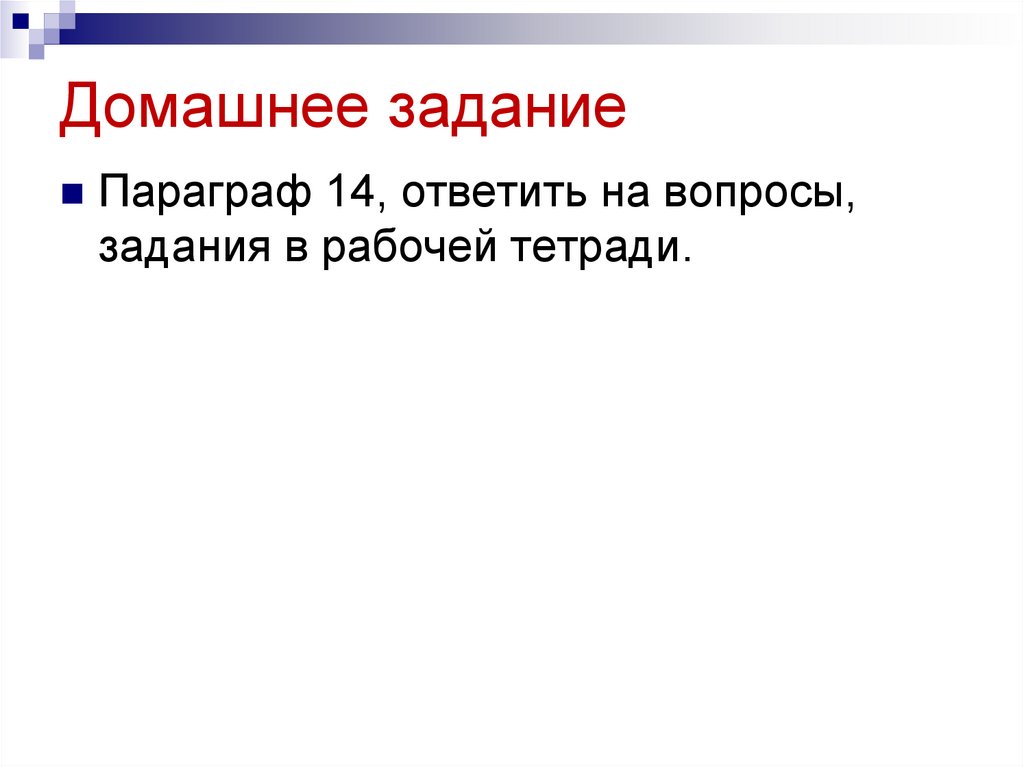 Параграф 14, ответить на вопросы,задания в рабочей тетради.