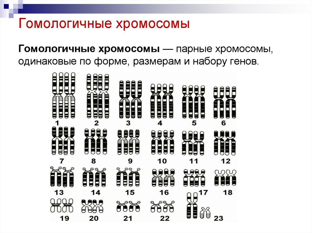 Гомологичные хромосомы — парные хромосомы,одинаковые по форме, размерам и набору генов.