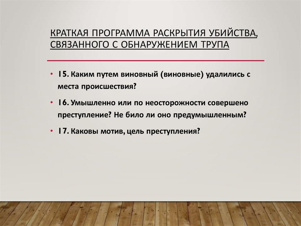 15. Краткая программа раскрытия убийства, связанного с обнаружением трупа