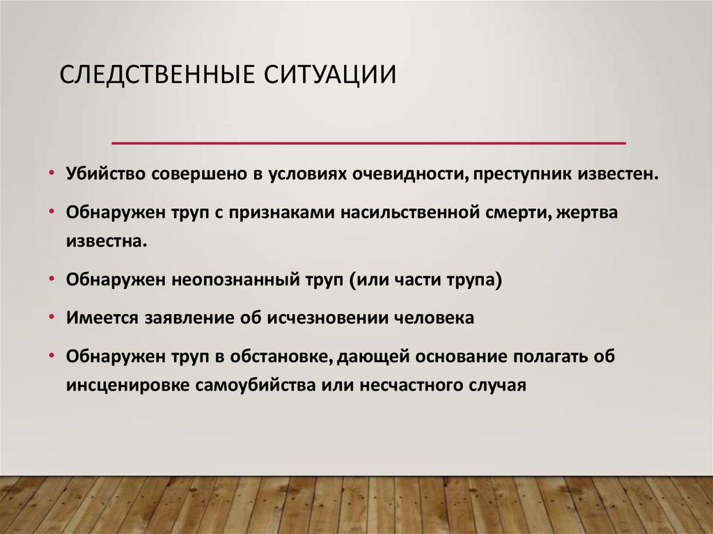 СЛЕДСТВЕННЫЕ СИТУАЦИИ• Убийство совершено в условиях очевидности, преступник известен.