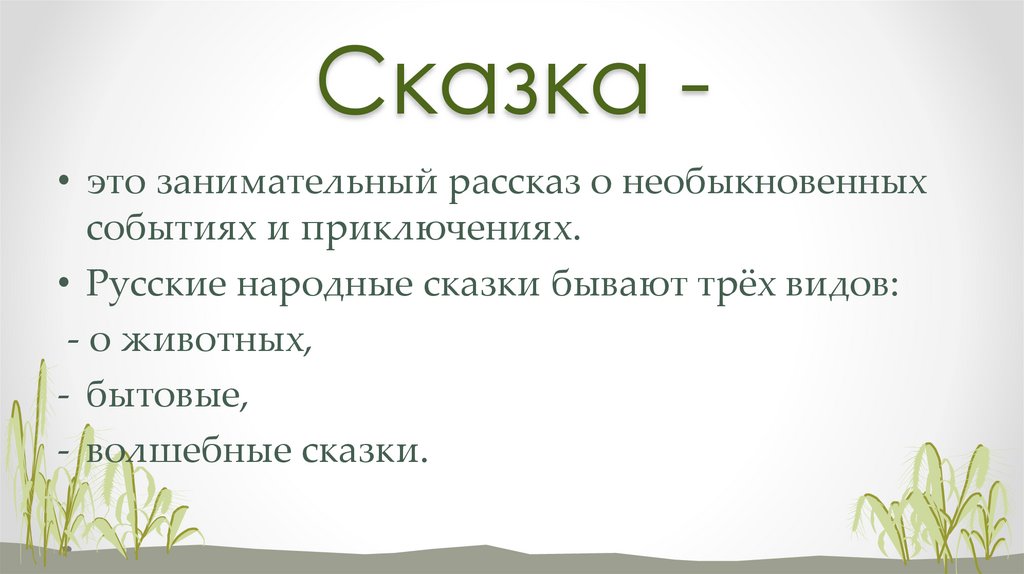 • Русские народные сказки бывают трёх видов: