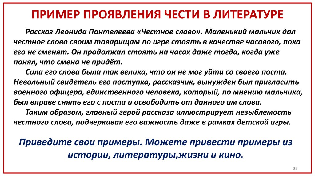 ПРИМЕР ПРОЯВЛЕНИЯ ЧЕСТИ В ЛИТЕРАТУРЕРассказ Леонида Пантелеева «Честное слово». Маленький мальчик дал