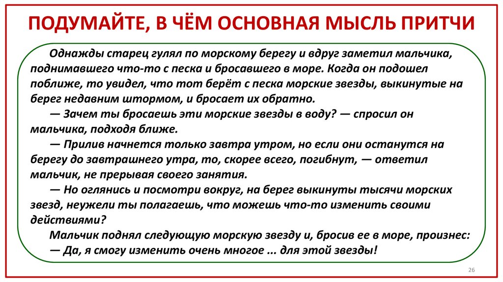 ПОДУМАЙТЕ, В ЧЁМ ОСНОВНАЯ МЫСЛЬ ПРИТЧИОднажды старец гулял по морскому берегу и вдруг заметил мальчика,