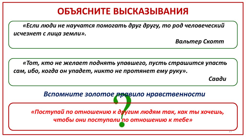 ОБЪЯСНИТЕ ВЫСКАЗЫВАНИЯ«Если люди не научатся помогать друг другу, то род человеческий