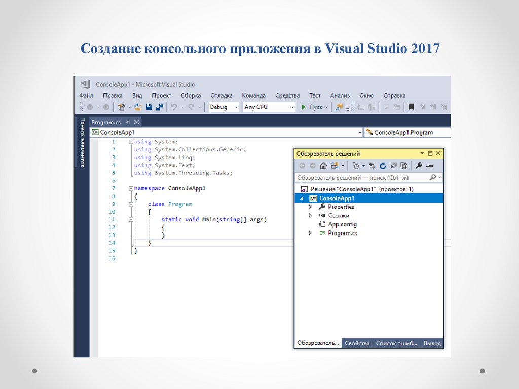 Создание консольного приложения в Visual Studio 2017«Консольные приложения наилучшим образом подходят для изучения языка, так как в них не