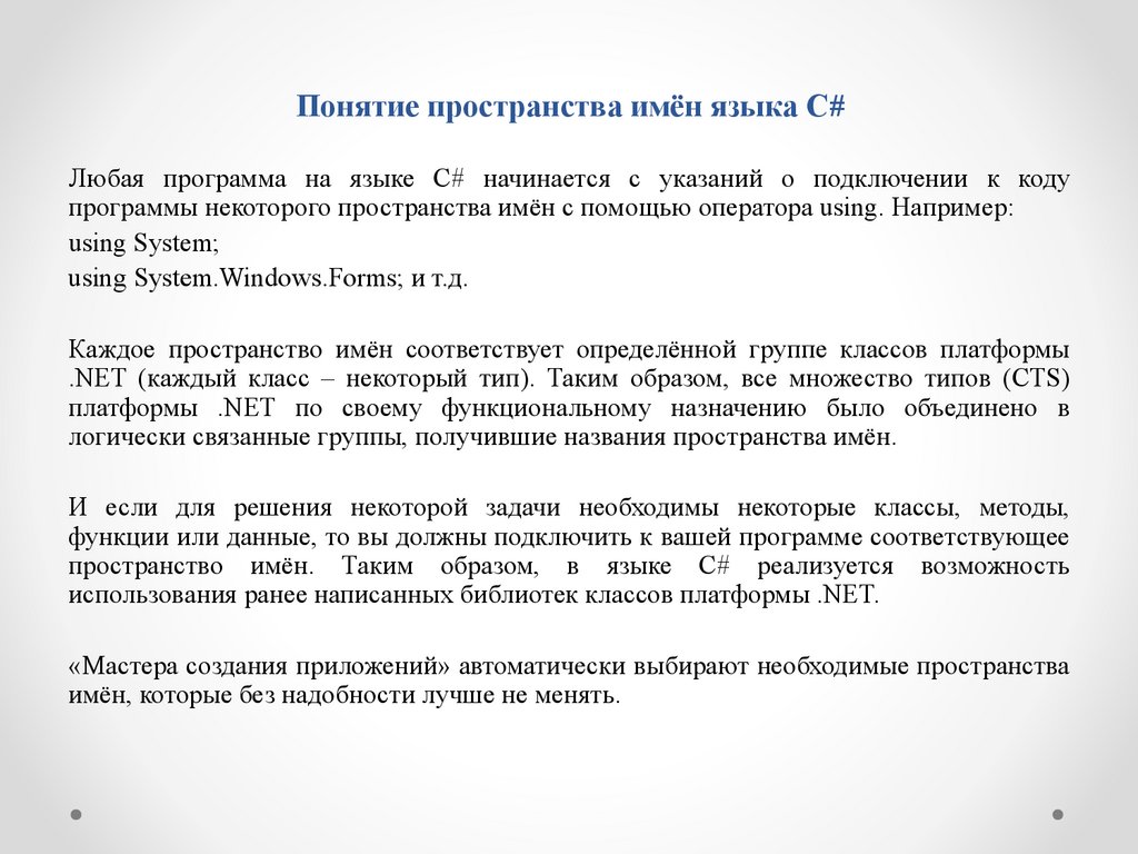 Понятие пространства имён языка C#Любая программа на языке C# начинается с указаний о подключении к коду