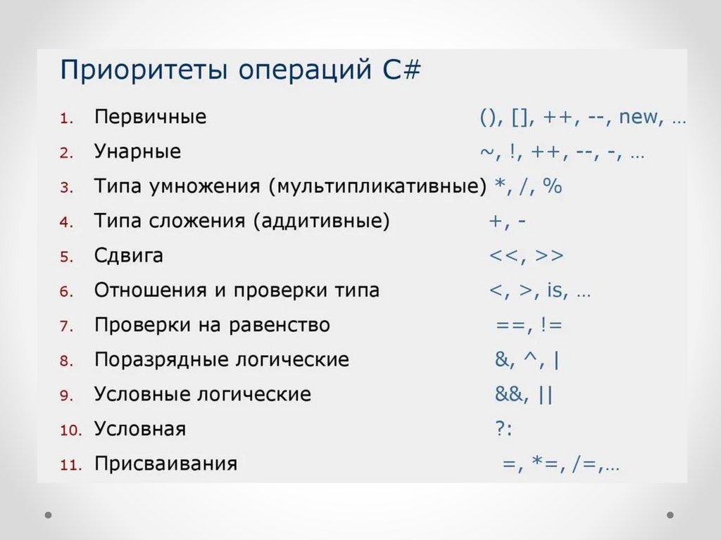 Приведите примеры операций в C# и их приоритет выполнения.