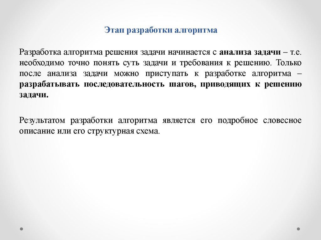 Этап разработки алгоритмаРазработка алгоритма решения задачи начинается с анализа задачи – т.е.