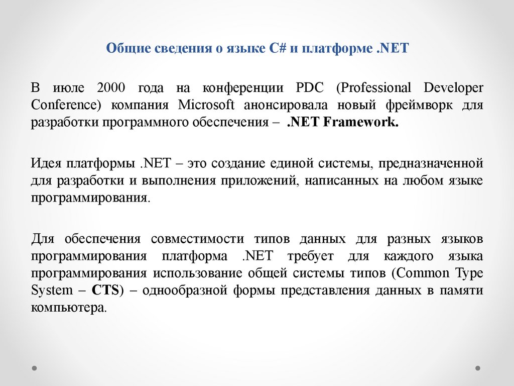 Общие сведения о языке C# и платформе .NETВ июле 2000 года на конференции PDC (Professional Developer