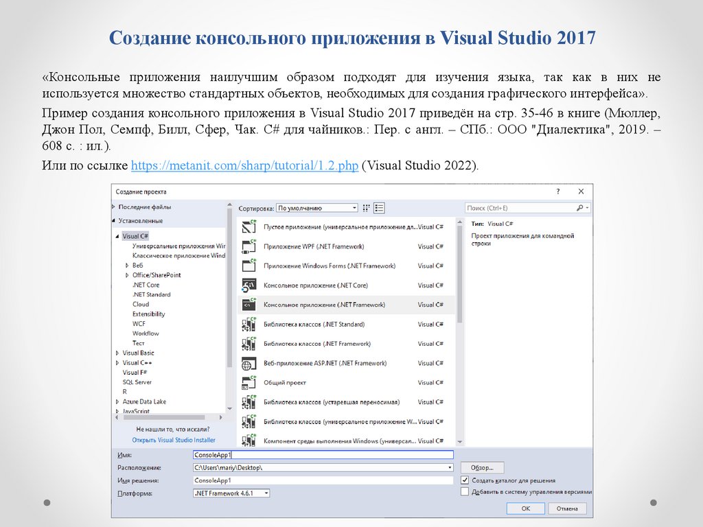 Пример создания консольного приложения в Visual Studio 2017 приведён на стр. 35-46 в книге (Мюллер,