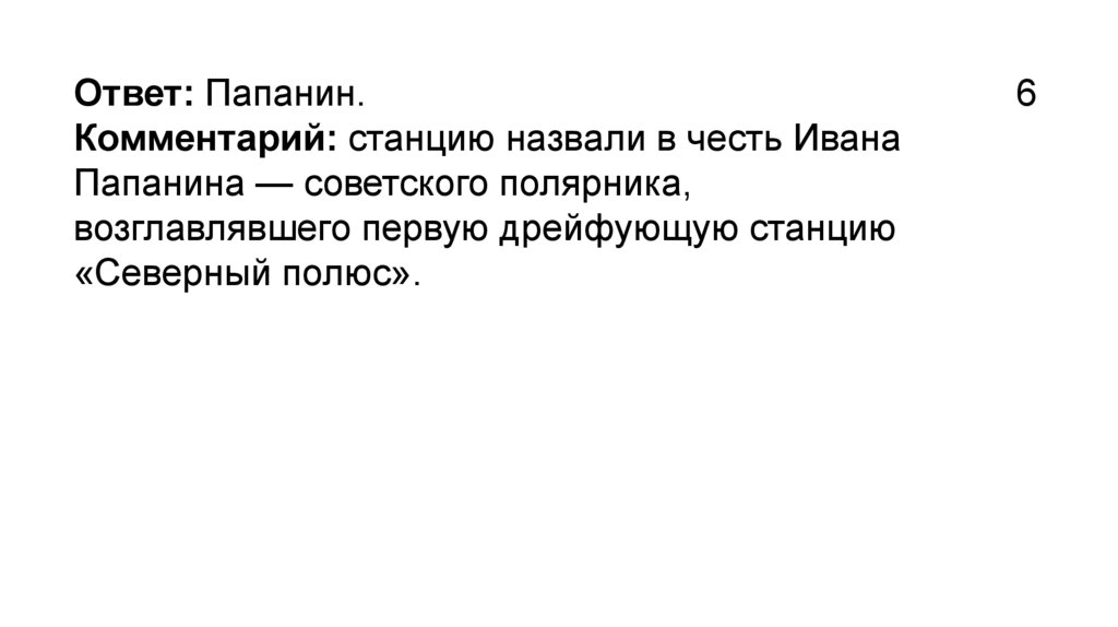 Ответ: Папанин.Комментарий: станцию назвали в честь Ивана