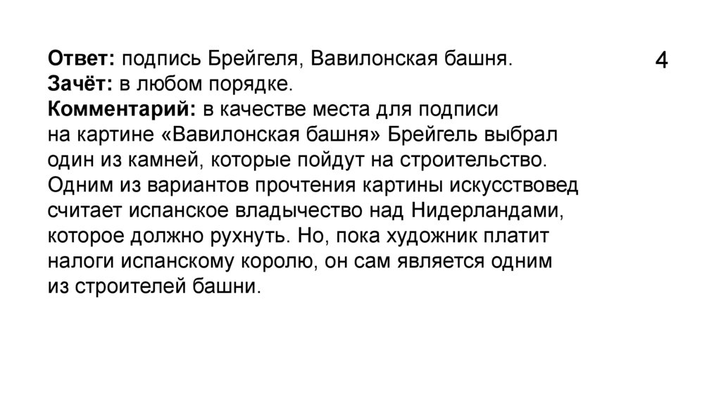 Ответ: подпись Брейгеля, Вавилонская башня.Зачёт: в любом порядке.