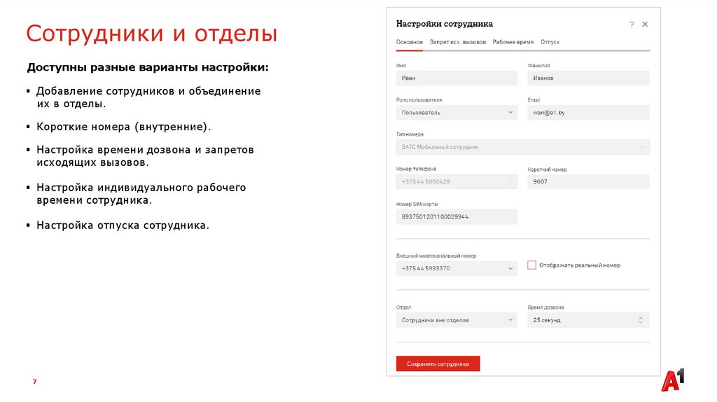 конкретному сотруднику. Доступно подключение общих пакетов минут и изменение