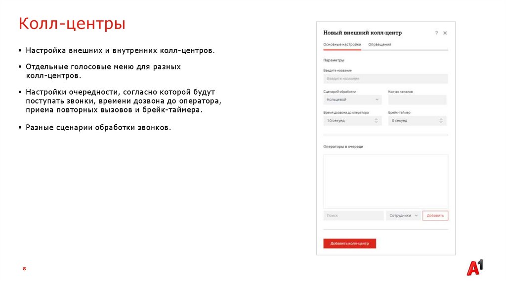 Колл-центрыНастройка внешних и внутренних колл-центров.