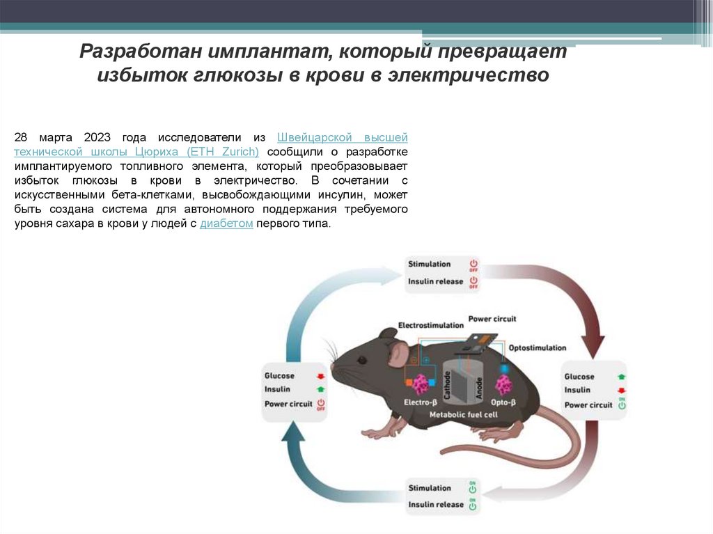 Разработан имплантат, который превращаетизбыток глюкозы в крови в электричество