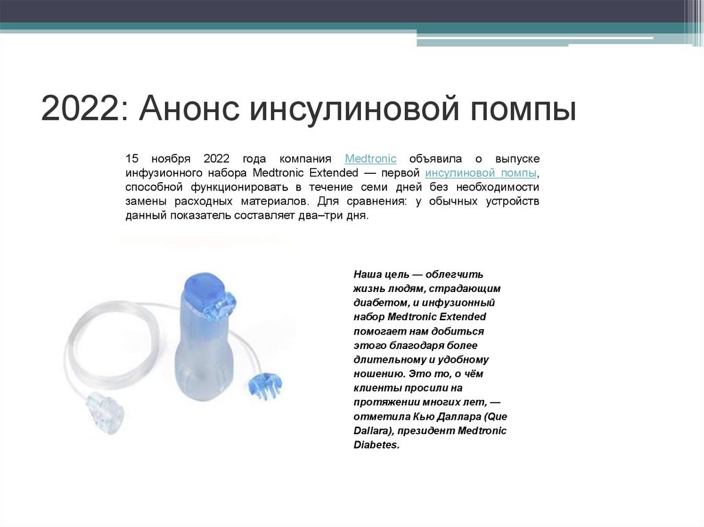 2022: Анонс инсулиновой помпы15 ноября 2022 года компания Medtronic объявила о выпуске