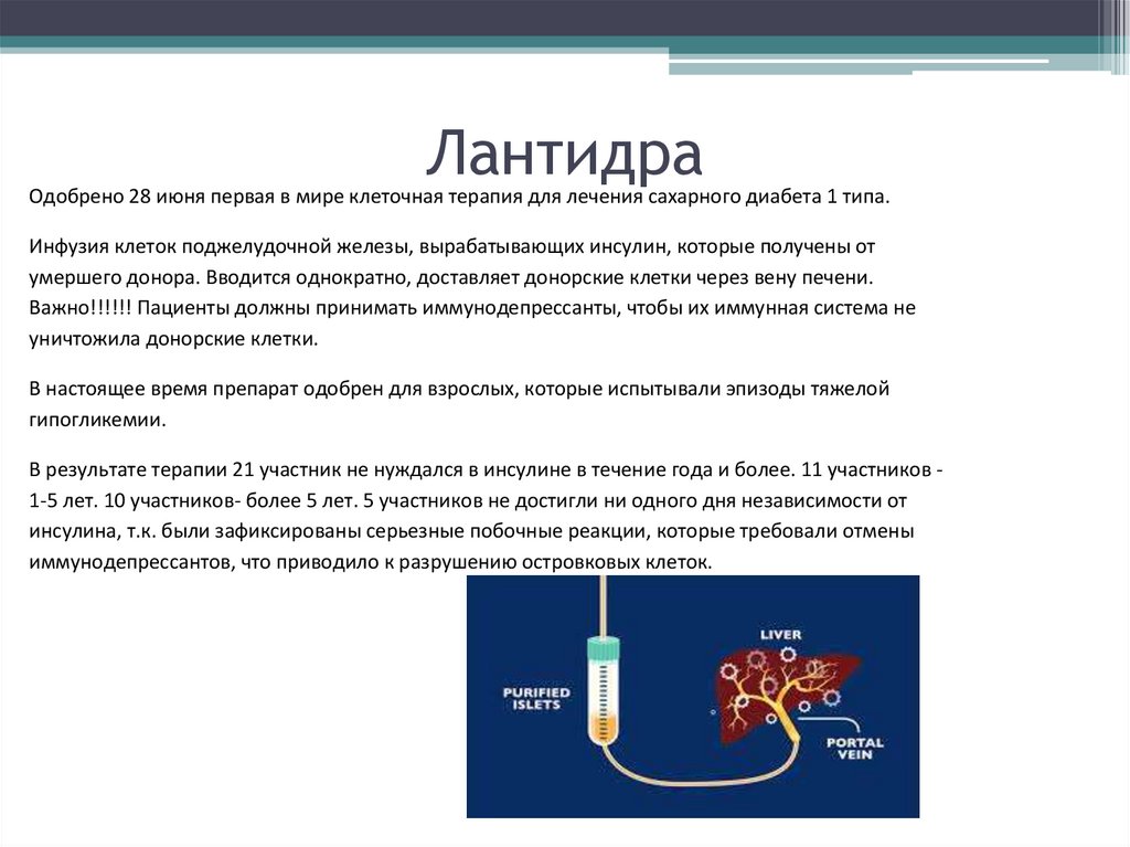 ЛантидраОдобрено 28 июня первая в мире клеточная терапия для лечения сахарного диабета 1 типа.