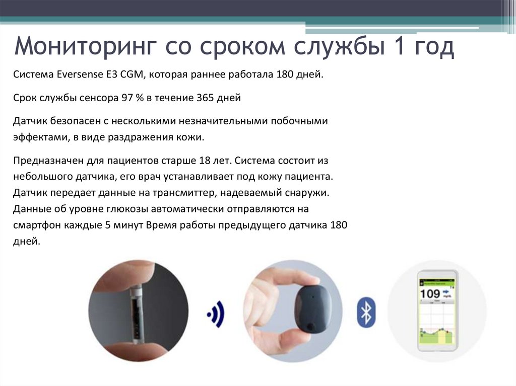 Мониторинг со сроком службы 1 годСистема Eversense E3 CGM, которая раннее работала 180 дней.