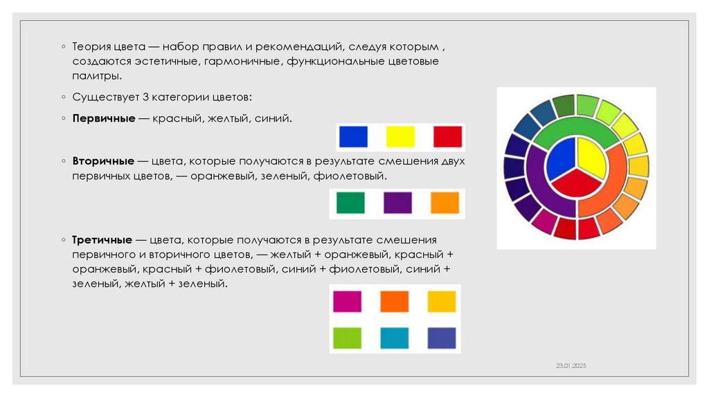 ◦ Теория цвета — набор правил и рекомендаций, следуя которым ,создаются эстетичные, гармоничные, функциональные цветовые